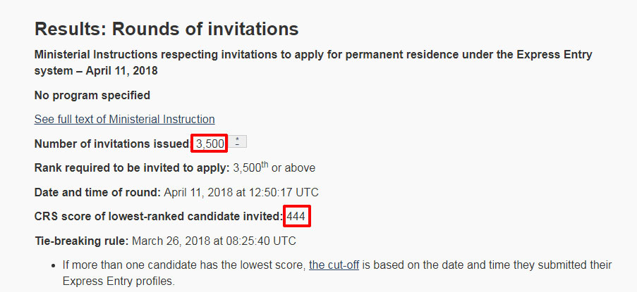 当地时间4月11日,Express Entry进行了第87轮邀请,不分职业,不分类别(本轮没有单独区分省提名技术移民PNP和FST联邦技工移民类),本轮最低邀请分数444分,邀请人数3500人(今年以来数量最多的一次)。相较上一轮邀请,获邀分数下降2分,获邀人数则增加500人。如果刚好444分的人数不止一人导致候选人超过3500人,那么同为444分的候选人根据进入池子的先后顺序决定是否被邀请。2018年EE计划邀请数量为74900人,目前总共邀请了21000人。而在2017年,EE目标邀请数为71700个申请,而实际总共发放了86023个申请。