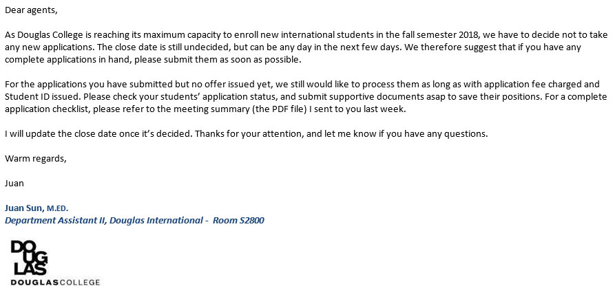 近期,温哥华兰加拉学院(Langara College)发出的正式通知中表明,确认各直录专业将暂停在2018年5月和2018年9月两个学期招收国际留学生,今年7月、9月、11月开学的语言双录取专业(LEAP + Target program)目前仍然开放。另外,道格拉斯学院(Douglas College )也发出类似通知,由于学校接纳国际留学生的数量有限,今年又收到了非常多的申请,学院将于近期暂停接收国际留学生在2018年9月入学的申请,具体时间待定,希望没有提交申请的同学在这几天尽快提交申请。