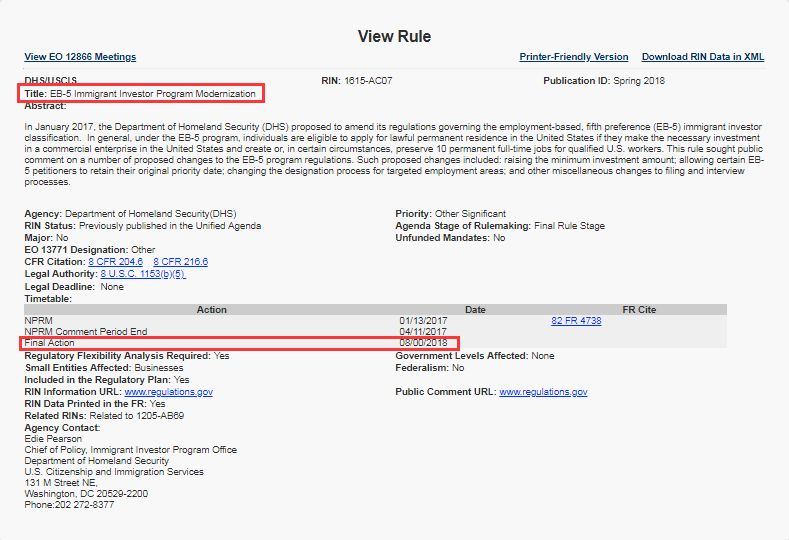 当地时间5月9日,美国行政管理和预算局(OMB)通过信息和监管事务办公室(OIRA)公布了2018年春季统一议程。这个一年两次的公告向公众公布了联邦机构正在审议或已经计划的拟议法规。其中,2018春季统一议程也更新了移民局EB-5改革的时间表:(1)EB-5投资移民计划现代化(RIN 1615-AC07)的最终执行日期从原来的2018年2月推迟到2018年8月,这一新规主要是针对最低投资额和TEA变更。(2)EB-5区域中心计划(RIN 1615-AC11)拟议新规的公告时间从原来的2018年10月推迟到2019年3月,这一新规主要是针对区域中心的申请和范本认证的审批程序。