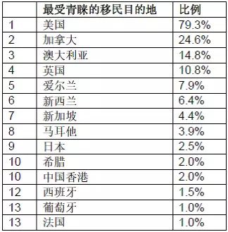 注:“最受青睐的移民目的地”与“中国移民指数”有所不同。“中国移民指数”是基于客观数据综合评出的最适合中国高净值人群投资移民的国家,而“最受青睐的移民目的地”是高净值人群的主观选择。