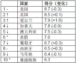 爱尔兰上升四位,排名第三。位于欧洲西部与英国隔海相望的爱尔兰,拥有优美的自然环境和完善的福利制度,并且具有完备的教育设施,尤其是计算机等尖端高科技水平名列世界前茅。此外,爱尔兰还是个低税国家。多元化而年轻的社会结构和诸多优势使爱尔兰移民成为移民界黑马。