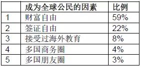 在这次的白皮书中,14%的受访高净值人群认为自己是全球公民。在这些受访者看来,财富自由是成为全球公民最重要的因素,其次是签证自由,接受过海外教育则位列第三。此外,全球公民还有两项显著特征:拥有多国的商务圈和朋友圈。