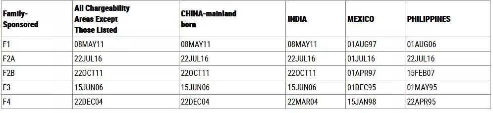 亲属移民8月“递件排期表”,中国大陆出生申请人全部原地踏步,具体情形如下: