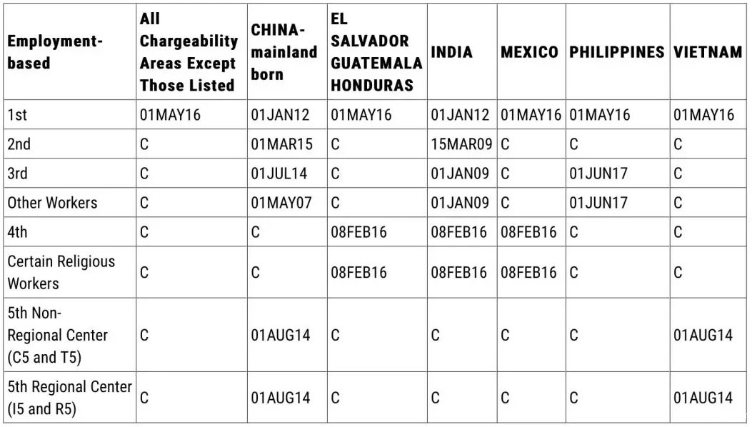 中国大陆出生申请人,EB-1维持在2012年1月1日;EB-2由2015年1月1日前进到2015年3月1日;EB-3由2013年1月1日前进至2014年7月1日;EB-4有名额;EB-5维持在2014年8月1日。