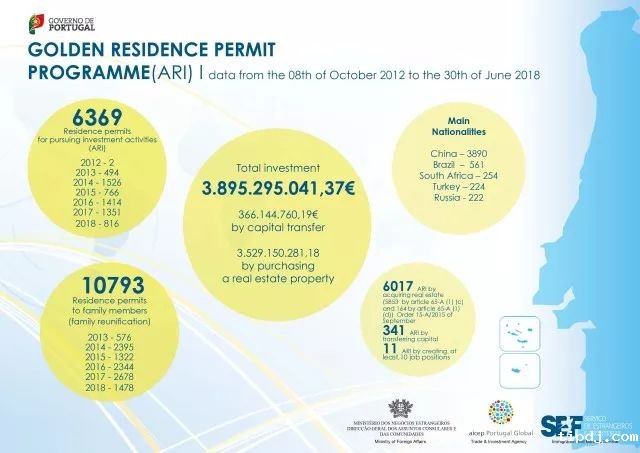 葡萄牙移民局(SEF)官方发布了截止到2018年6月30日黄金居留获批的最新数据。(1)累计投资额:目前为止,葡萄牙黄金居留许可项目总投资额约为38.95亿欧元,其中房地产贡献约为35.29亿欧元。(2)主申获批人数:6月份有90位主申请人获批,累计总共6369位投资人成功获批黄金居留许可。(3)附属申请人数:6月份有150位附属申请人成功获批,黄金居留许可累计附属申请人数为10793人。(4)投资者来源:在目前6369位获批的投资者中,中国有3890人(占比约61%)。