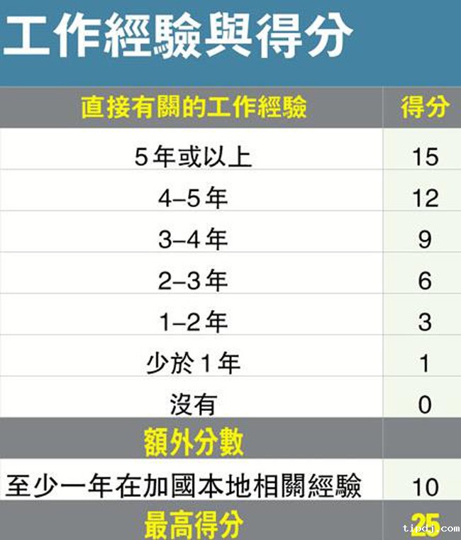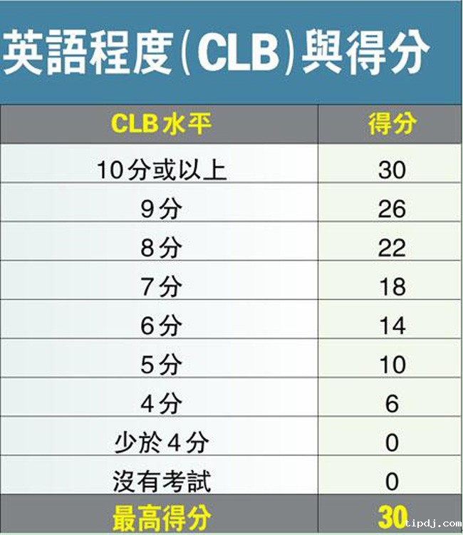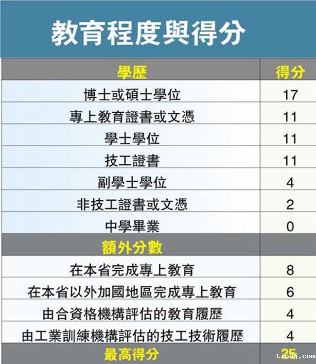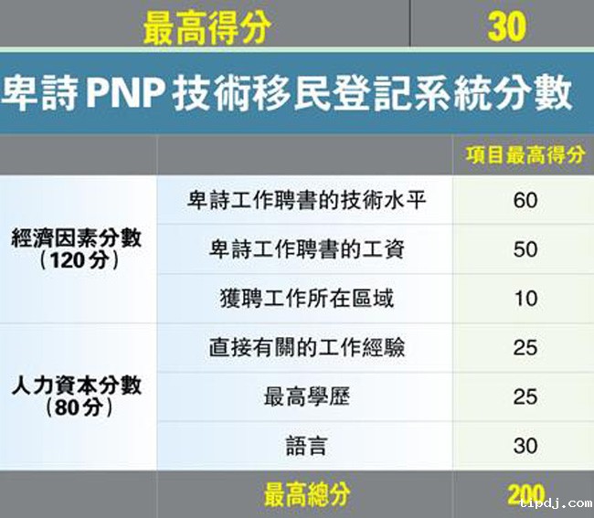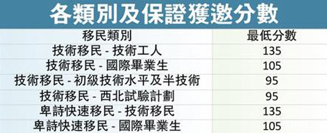 据悉,技术移民登记系统的满分为200分,分为两大类:经济因素满分为120分;人力资本因素满分为80分。经济因素所列的包括:工作聘书所需的技术水平(最高分60分)、工资(最高分50分)、获聘工作所在区域(最高10分);人力资本因素所列的包括:直接有关的工作经验(最高25分)、教育(最高25分)、语言(最高30分)。
