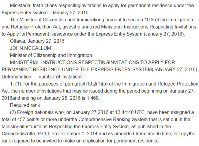 加拿大移民快速通道第26次邀请 最低分数达到457