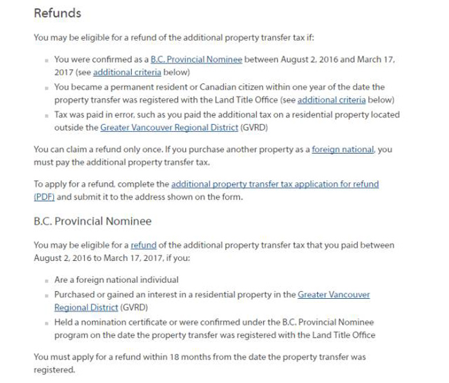 1.BC省PNP获得者,其所购置的住宅作为自住之用,那么这类人群就可以不需要再缴15%外国买家税,而在去年8月2日之后购房缴税的PNP提名者可申请税金退款。申请表格可在BC省政府网站上查阅。