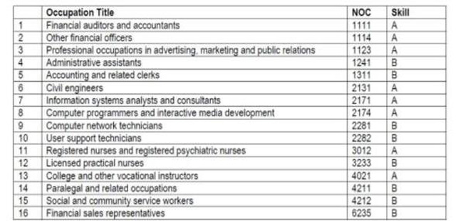 金融审计师、会计师;其它类金融官;广告、市场、公共关系专业人士;行政助理;会计及相关职员;工程师;信息系统分析师、顾问;计算机程序员、多媒体开发员;计算机网络技师;用户支持技师;注册护士和注册理疗护士;特许护士;社区学院和其它职业培训教师;律师助理和相关职业;社工及社区服务人员。