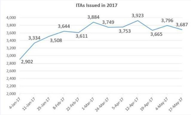 但是,如果大开移民的尺度,申请人数暴增将成为令人担忧的问题。CIC News曾表示,自2015年EE通道开放以来,一共抽选了104,614名申请人。而至今为止,2017年EE通道已选出43,456名申请人,占总数的42%,已经超过前两年EE实行的总人数(43,202)。