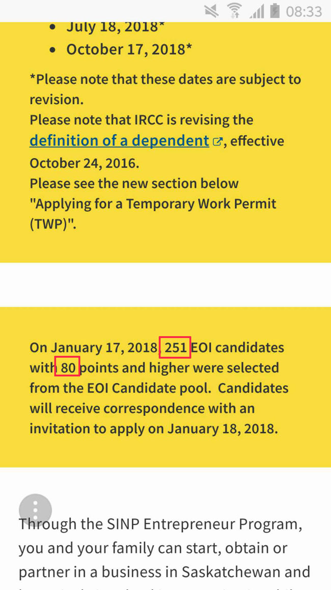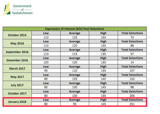 温哥华分公司第一时间获得最新消息,当地时间1月17日,萨省移民局公布了2018年第一轮商业移民项目筛选结果:EOI分数继续维持近几次筛选的最低分——80分,最高分145分,平均分95分,共计251位候选人获得邀请!