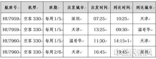 “深圳-天津-温哥华"航线时刻表