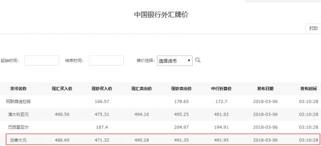 中国银行最新外汇牌价显示,北京时间3月6日,加拿大元的现钞卖出价是491.35。