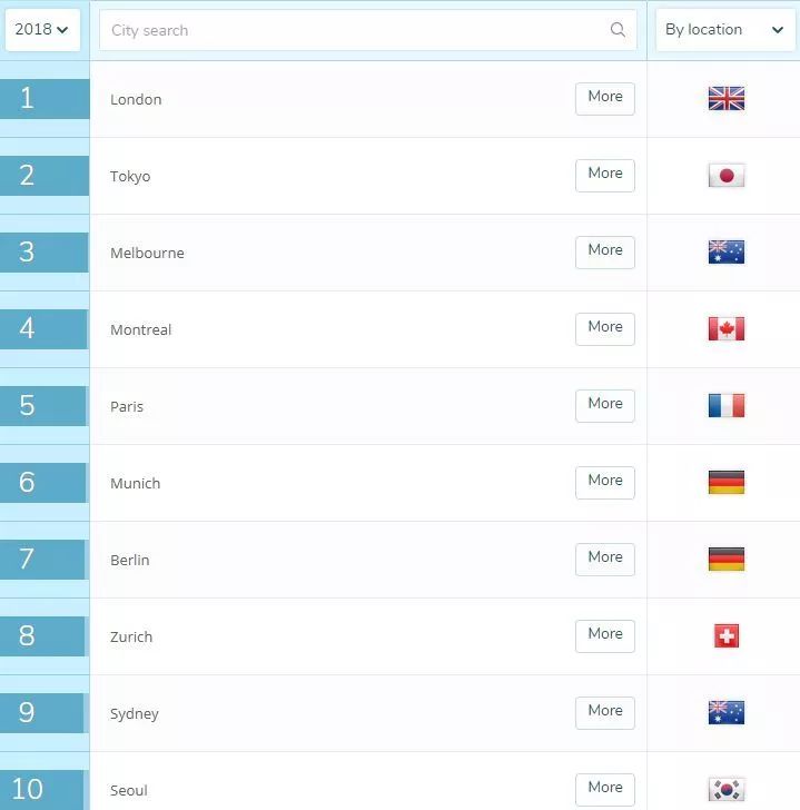 英国伦敦,日本东京,澳大利亚墨尔本分列前三名,加拿大蒙特利尔紧随其后排名第四。其他加拿大城市的排名分别为:多伦多第13、温哥华第17、渥太华第46、魁北克城第88。
