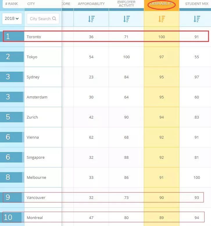 多伦多在受期望程度这一项里排名世界第一,拿到100分。温哥华和蒙特利尔排名第9,第10名,分别拿到90分和89分。