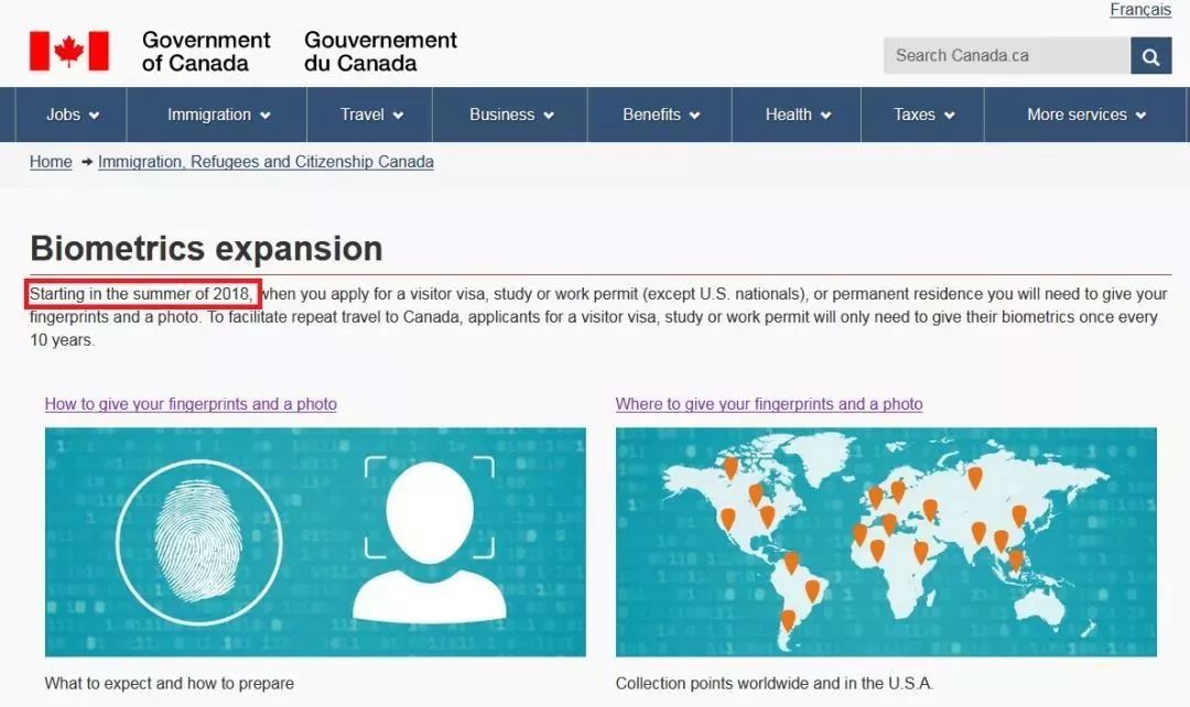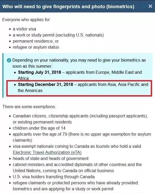 来自欧洲、中东和非洲的申请人将于7月31日起,来自亚洲、亚太和美洲的申请人将于12月31日起,在申请加拿大签证时须亲赴签证中心录指纹。