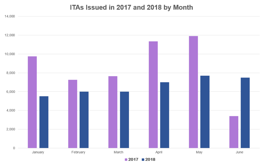 从每个月来看,除了六月份,2018前五个月的ITA数量都要落后于2017年,尤其是2018年一月份,要比工作人员所预料的要低很多;只有六月份更加接近工作人员的预期目标。