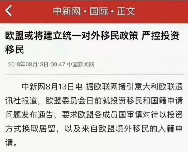 欧盟司法事务专员维拉•尤罗瓦(Vera Jourova)对欧盟个别国家开放投资移民、放宽境外移民入籍条件换取资金的做法表示担忧,并强调:欧盟委员会决定在秋季成员国领导人峰会上,就投资移民和境外移民入籍问题进行磋商,谋求制定欧盟统一的国籍和移民政策,全面禁止“金钱换护照”。