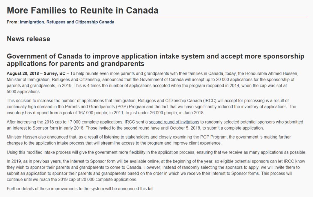 2019年,与往年一样,申请表格将在年初在线提供,因此符合条件的潜在担保人可以让移民部知道申请者担保父母或祖父母来加拿大的意愿。接着,根据移民部收到担保人申请意向表的顺序来决定申请资格,而不是随机抽取。这个过程将持续到2019年所有申请名额完成为止。