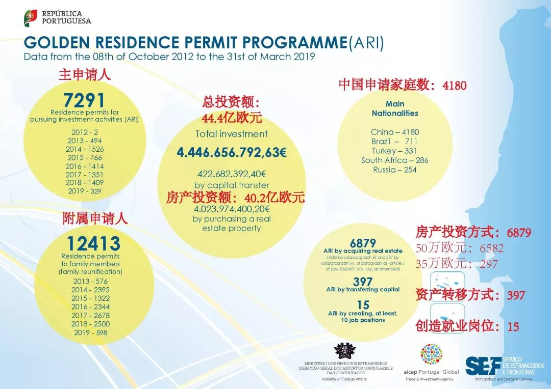 葡萄牙移民局(SEF)官方发布了截止到2019年3月31日黄金居留获批的最新数据。累计投资额:目前为止,葡萄牙黄金居留许可项目总投资额约为44.4亿欧元,其中房地产贡献约为40.2亿欧元。主申获批人数:3月份有83位主申请人获批,累计总共7291位投资人成功获批黄金居留许可。附属申请人数:3月份有159位附属申请人成功获批,黄金居留许可累计附属申请人数为12413人。投资者来源:在目前7291位获批的投资者中,中国有4180人(占比约60%)。