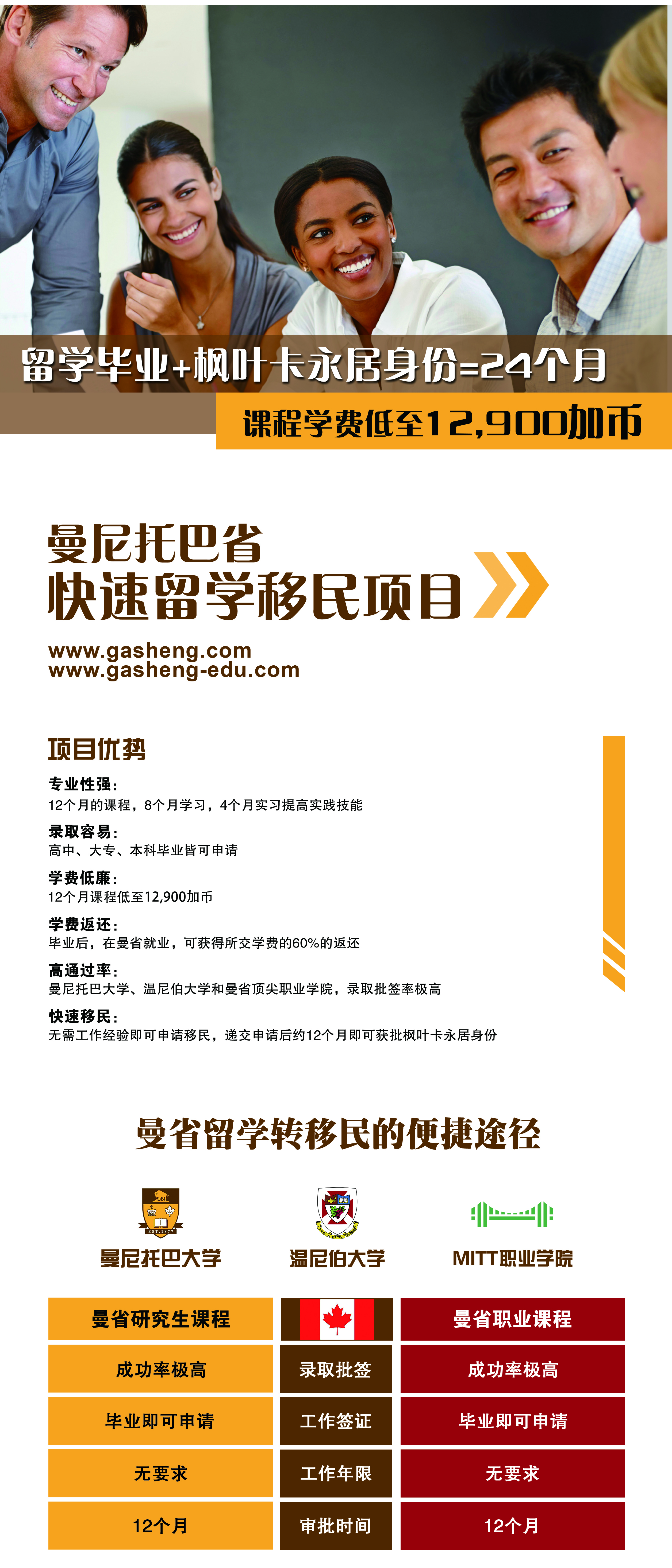 省——学费/生活费省,较其它省份便宜,并且毕业工作后政府将返还学费60%。在加拿大曼省学费较低,文凭获全球认可。真实工作,有收入,移民加拿大后享受公民待遇,如继续选择攻读更高学位,学费仅为留学生1/3。