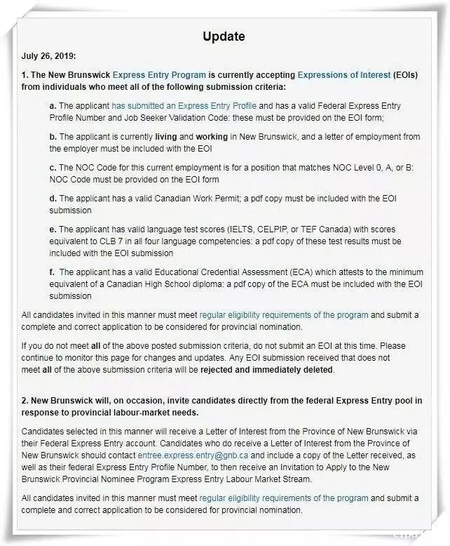 NB省移民局将不定期根据NB省劳动力市场需求,从EE候选池(技术类申请人需要满足67分评分标准)中挑选并邀请部分申请人申请NB省移民。