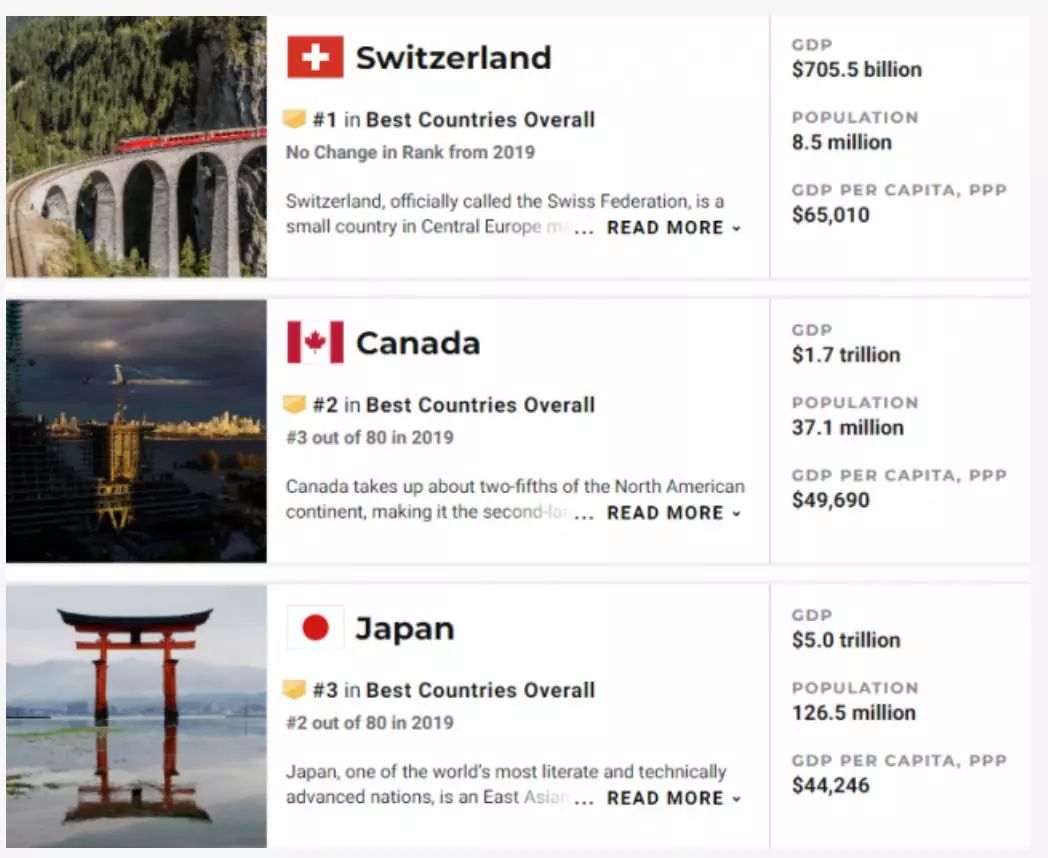 《美国新闻与世界报道》每年都公布全球最佳国家排名,今年的排名与往年一样,也是联合BAV集团和宾夕法尼亚大学沃顿商学院(Wharton School)共同进行。