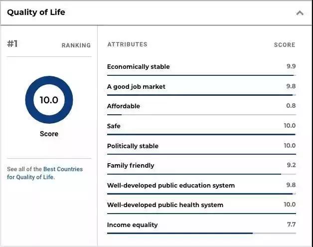 《美国新闻与世界报道》(US News & World Report)2020年全球最佳国家排名榜新鲜出炉,在整体排名中,加拿大比2019年提升一个身位,力压日本跃居第二,仅次于瑞士;在生活质量单项中排名第一!