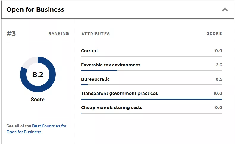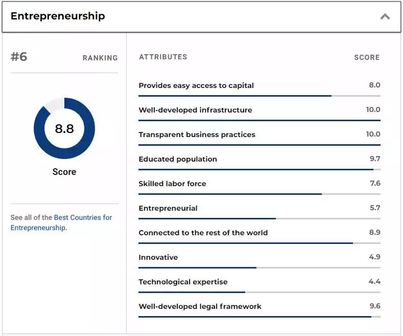 在全球最佳国家排名的商业最开放国家排名中,加拿大排名第三,前二分别为卢森堡与瑞士。其中,加拿大的【政府透明的推动】指标分数高达10!