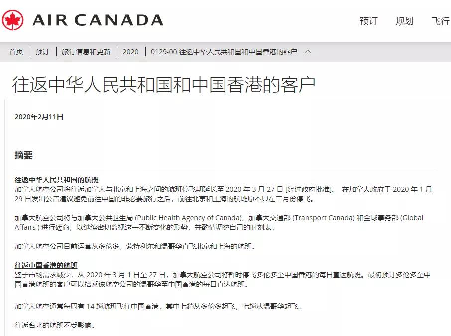 2月12日,加拿大航空发布航班调整通告,经政府批准(subject to government approval)后,往返于加拿大和北京/上海之间的航班停飞期将延长至2020年3月27日。
