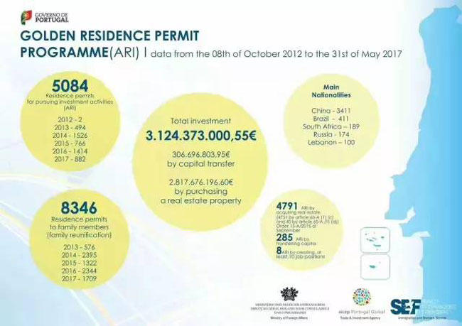 欧洲分公司提供的最新消息,葡萄牙移民局(SEF)官方发布了截止到2017年5月31日黄金居留获批的最新数据。一起随小编来看看具体数据的分析吧。