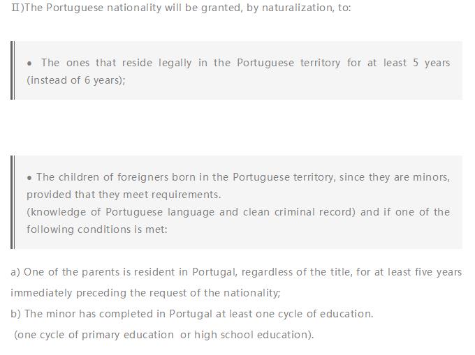 (2)出生在葡萄牙境内的外国人子女,因为他们是未成年人,只要他们符合要求(掌握葡萄牙语能力和无犯罪记录),并且满足下列条件之一:①父母其中一方在申请国籍之前无论以何种身份居住在葡萄牙至少5年;②未成年人在葡萄牙完成至少一周期的教育(一个小学周期的教育或高中教育阶段)。