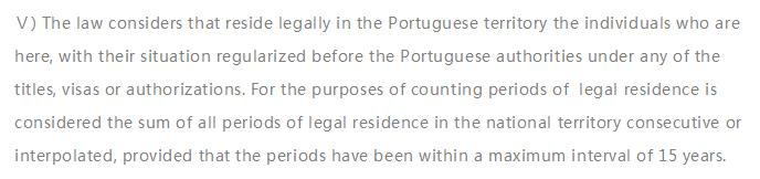5.法律认为,在葡萄牙境内合法居住的个人,无论他们持有葡萄牙当局所颁布的任何身份、签证或正规化授权居住许可,所计算合法居留的期限为连续或间断的所有合法居住期间的总和,前提是最长期限为15年。