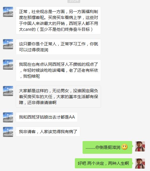 西班牙的制度给予了西班牙人足够的安全感,不需要为教育、医疗担心,不需要攒钱也可以生活的很幸福,结婚时不需要房子、彩礼作为安全感的筹码,出去约会吃饭也不需要男生“打肿脸充胖子”请客。