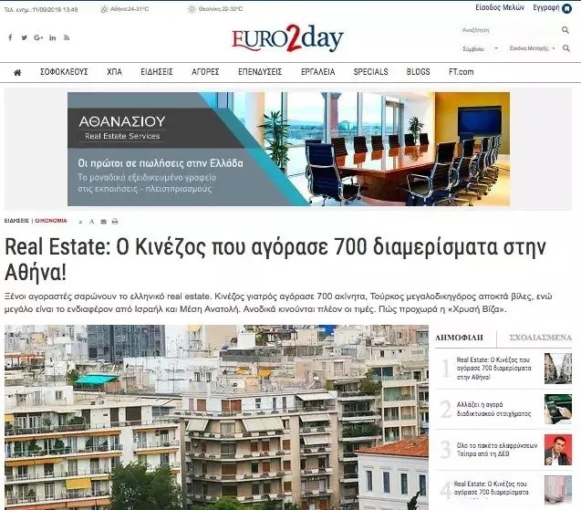 据希腊本地新闻媒体Euro2day的报道,一名来自中国的投资者(据说该买家的职业是医生)在今年7月大手扫入雅典70处房产物业,购买公寓总数量达到惊人的700套之多。在此次买入的物业中,他还斥资1400万欧元买下了Stadiou大街上最大的办公楼!消息震惊了当地社会,有评论指出,庞大的销售数字背后,是中国投资者非凡的行动力与购买力!