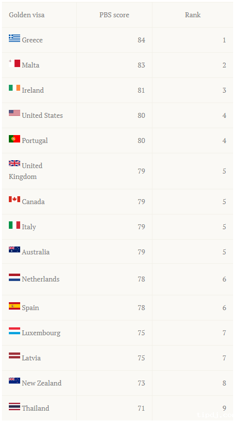 第一名希腊,原因:在2019年的黄金签证排名中名列第一,满分100分中获得84分。