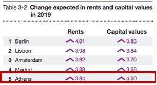 以首都雅典为例,根据2019年租金及资本价值变化预估数据表明,雅典的租金以及房价都呈现增长的趋势,总体涨幅排名也由2018年的第19名上升至第5名。