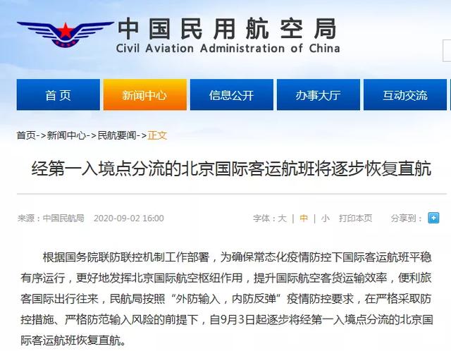 9月3日起,民航局先行恢复了8个国家直航北京的航班。除希腊外,还包括柬埔寨、巴基斯坦、希腊、丹麦、奥地利、瑞典、加拿大等7个输入病例较少国家至北京的9个航班。