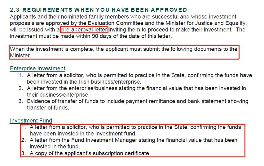 除了再次重申不得融资以外,此次法案更新还首次提到了“预批复”环节,即投资人的投资申请由评估委员会和爱尔兰司法和平等部长批准后将获得“预批函”。