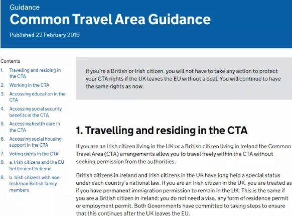 英国、爱尔兰、马恩岛和海峡群岛这四个国家和地区为共同旅游区(Common Travel Area CTA)。根据CTA,爱尔兰和英国公民享有一系列互惠权利,包括:自由出入及居住、工作无需申请工作许可、获取同本国居民相同的教育、福利、医疗、社会住房资源,并且享有在地方和议会选举中投票的权利。即使是在英国脱欧之后,爱尔兰公民依旧可以无条件的在英国居留,没有任何附加条件。