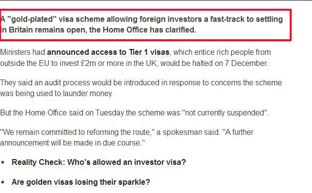 不久后,最开始喊“狼来了”的BBC也发布了打脸新闻:“镀金”投资移民签证项目“没有暂停”。