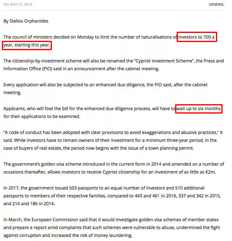 当地时间5月21日,根据塞浦路斯媒体传来的最新消息,塞浦路斯政府拟将对入籍法案做出如下调整:(1)加强背景调查的强度,审批时间或从原来的3个月延长至6个月;(2)政府申请费将会适度提高,具体额度尚未公布;(3)每年限制入籍名额为700个(具体名额是针对申请个案数或是人数尚待官方公布)。以上调整及细节还需要等待官方正式通知,预计是今年起实施。