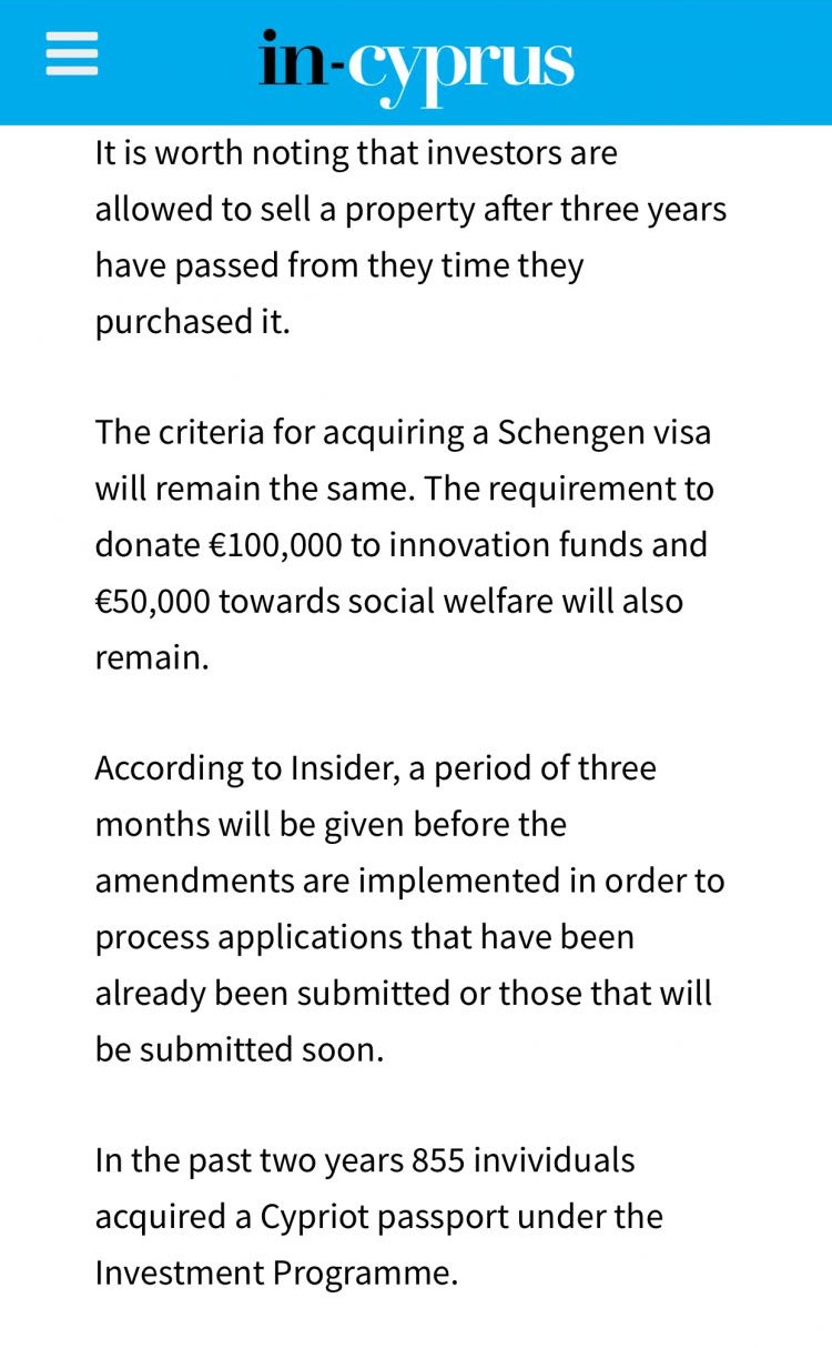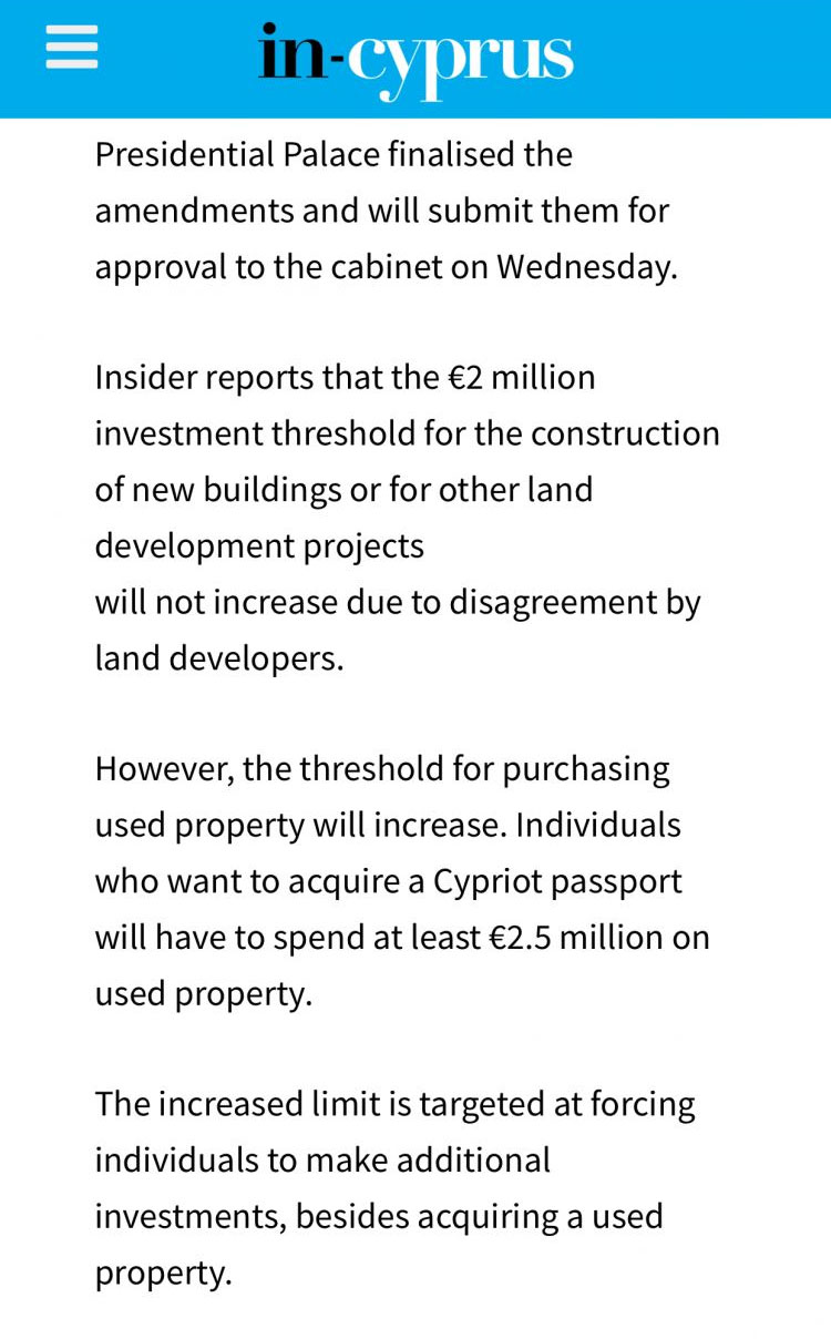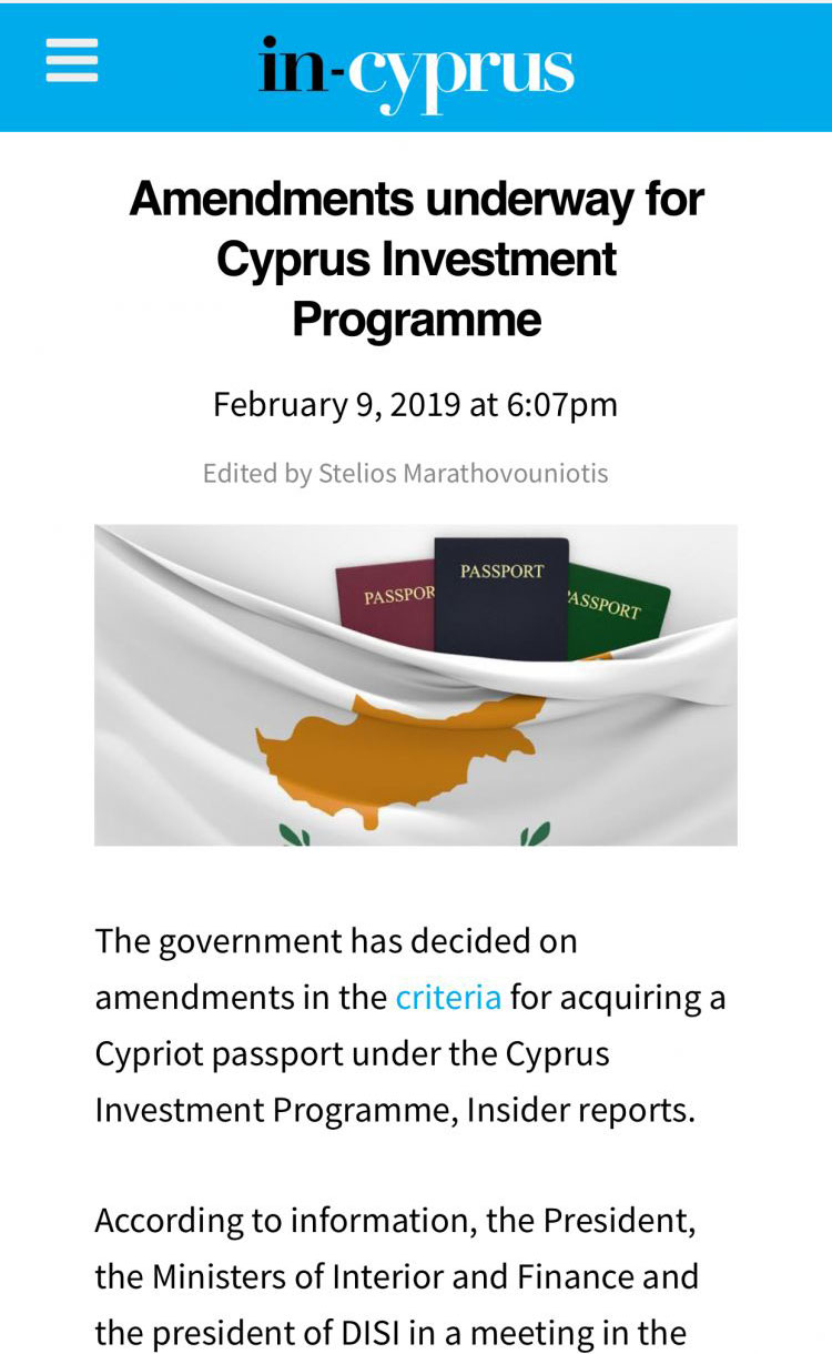 据塞浦路斯第一大报phileleftheros等媒体报道:塞浦路斯正着手改变其护照投资计划的规则,此前塞浦路斯被欧盟委员会批评为对安全和可能促进不当交易具有潜在危险。