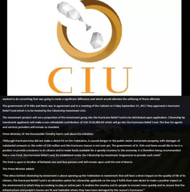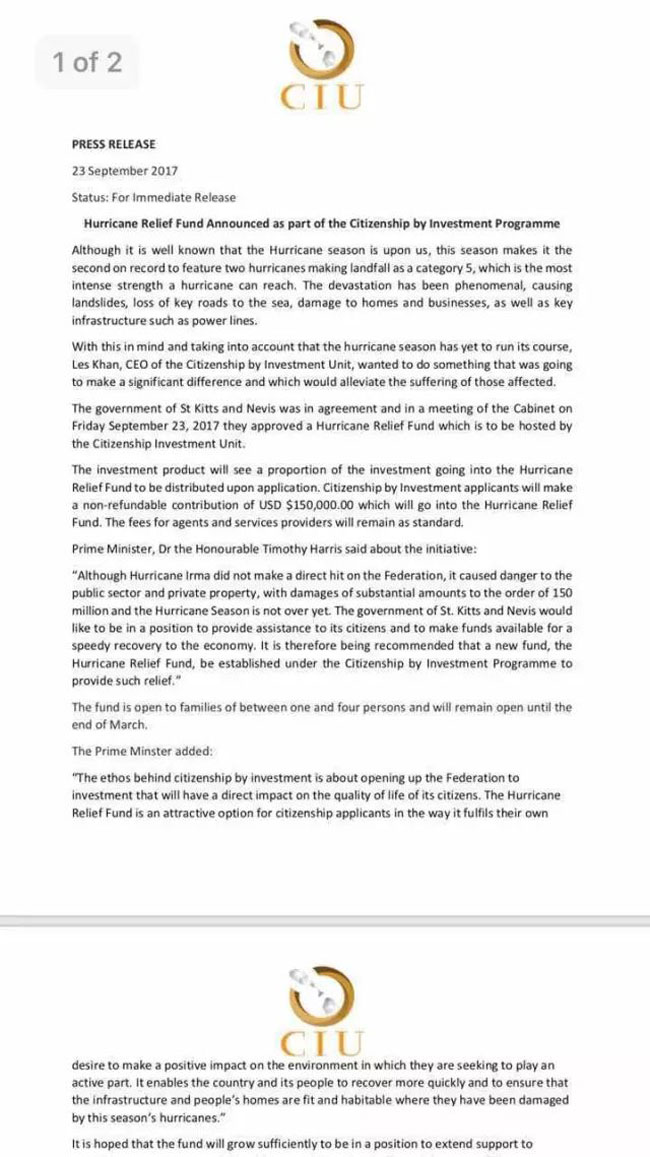这次传出政策优惠的就是针对第二种投资方式——向基金会捐款25万美元。当地时间9月23日,圣基茨和尼维斯政府官网发布消息:最近加勒比地区遭受了连续两个5级(飓风最高级别)飓风袭击,Irma and Maria, 飓风虽未直接登陆圣基茨,也给当地带来了一定经济损失。为了尽快恢复本国经济,同时协助邻国恢复经济,圣基茨移民局确定成立“飓风抗灾基金”,其中申请人四人以内捐款为15万美金,其余费用不变,有效期为6个月,即2018年3月底止。