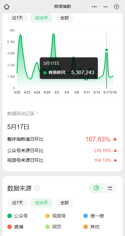 根据微信搜索指数显示,近日“香港移居”一词热度日暴涨167.83%,超过530万。